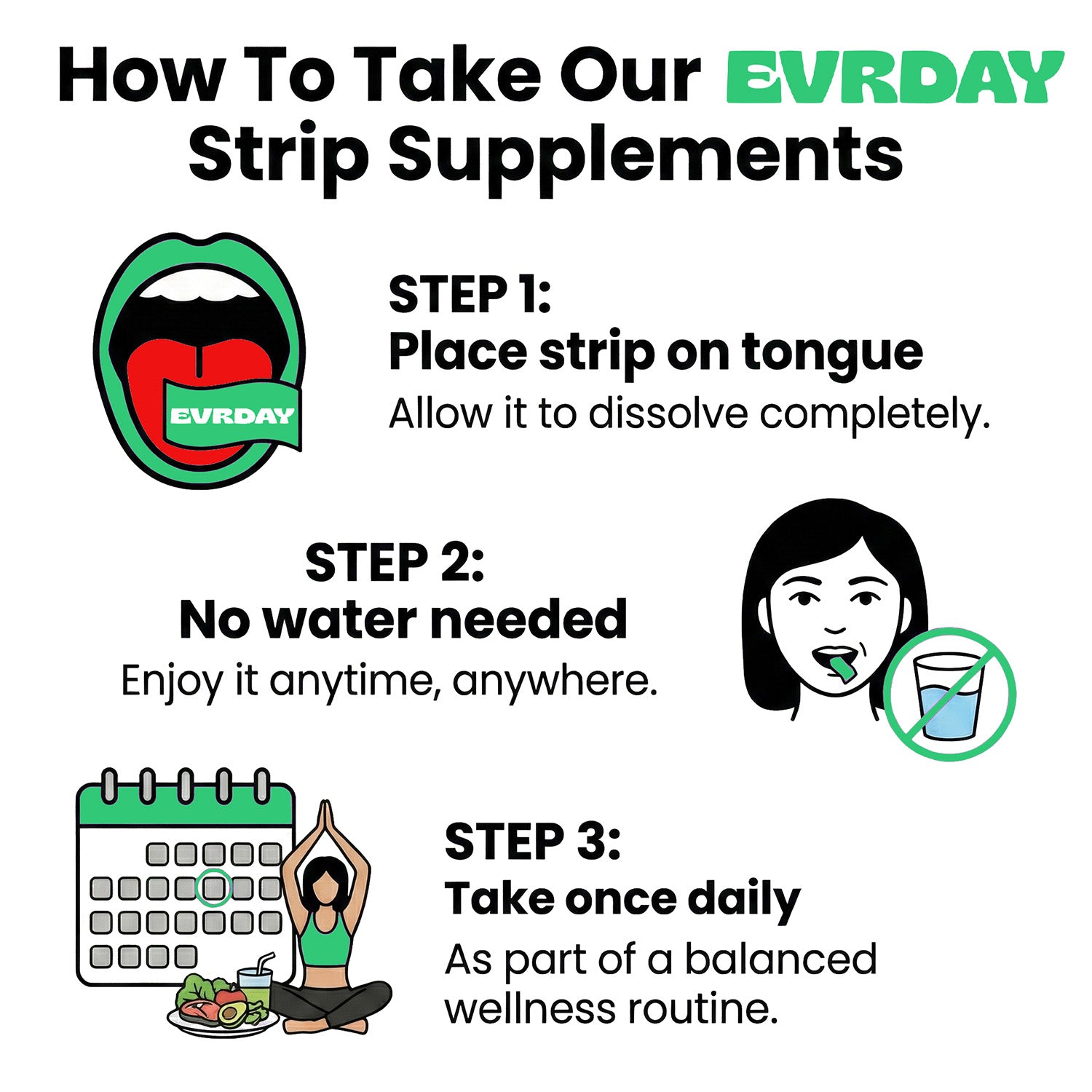 To use, place one oral strip on your tongue and allow it to dissolve completely. Take one strip per day. These statements have not been evaluated by the Food and Drug Administration. This product is not intended to diagnose, treat, cure, or prevent any disease.