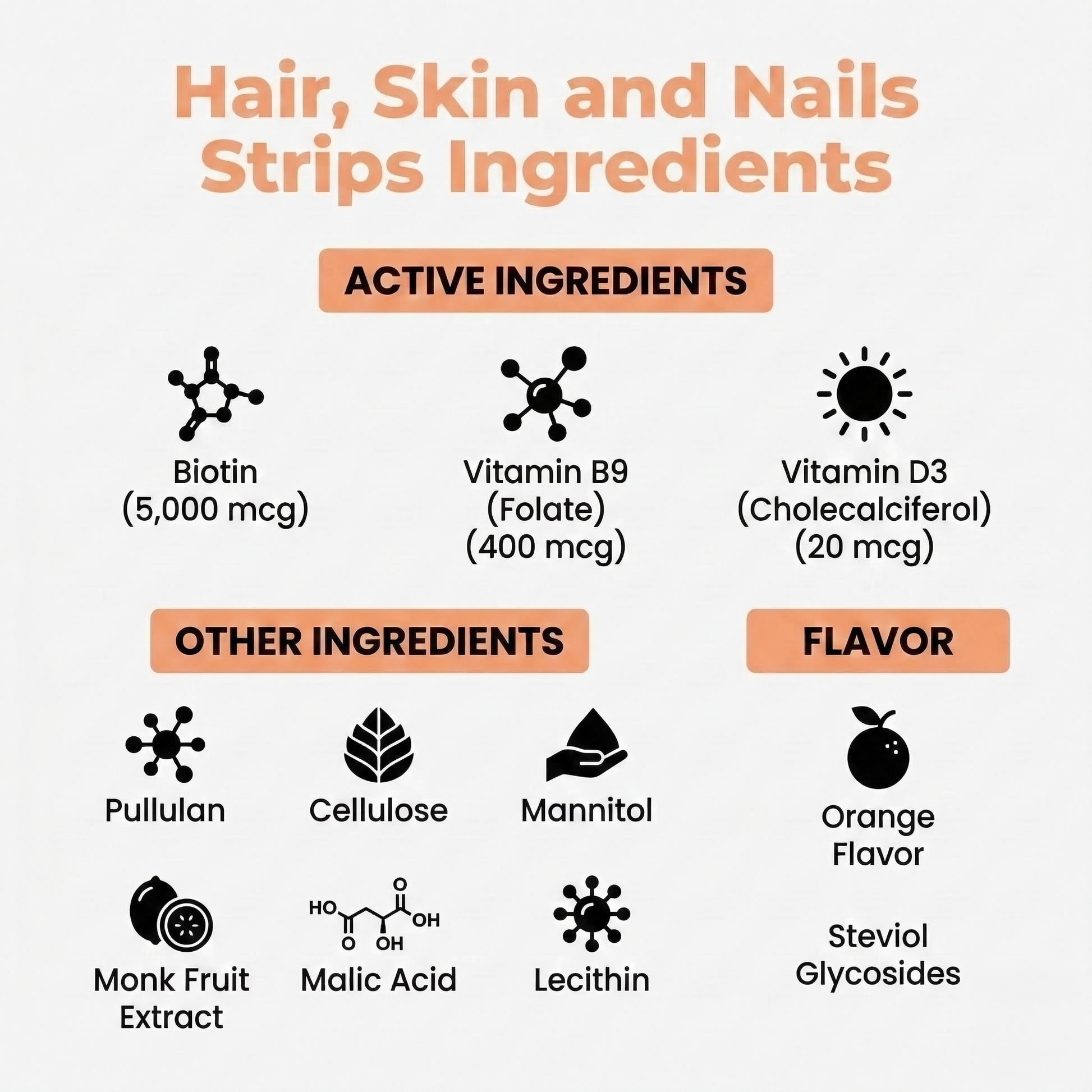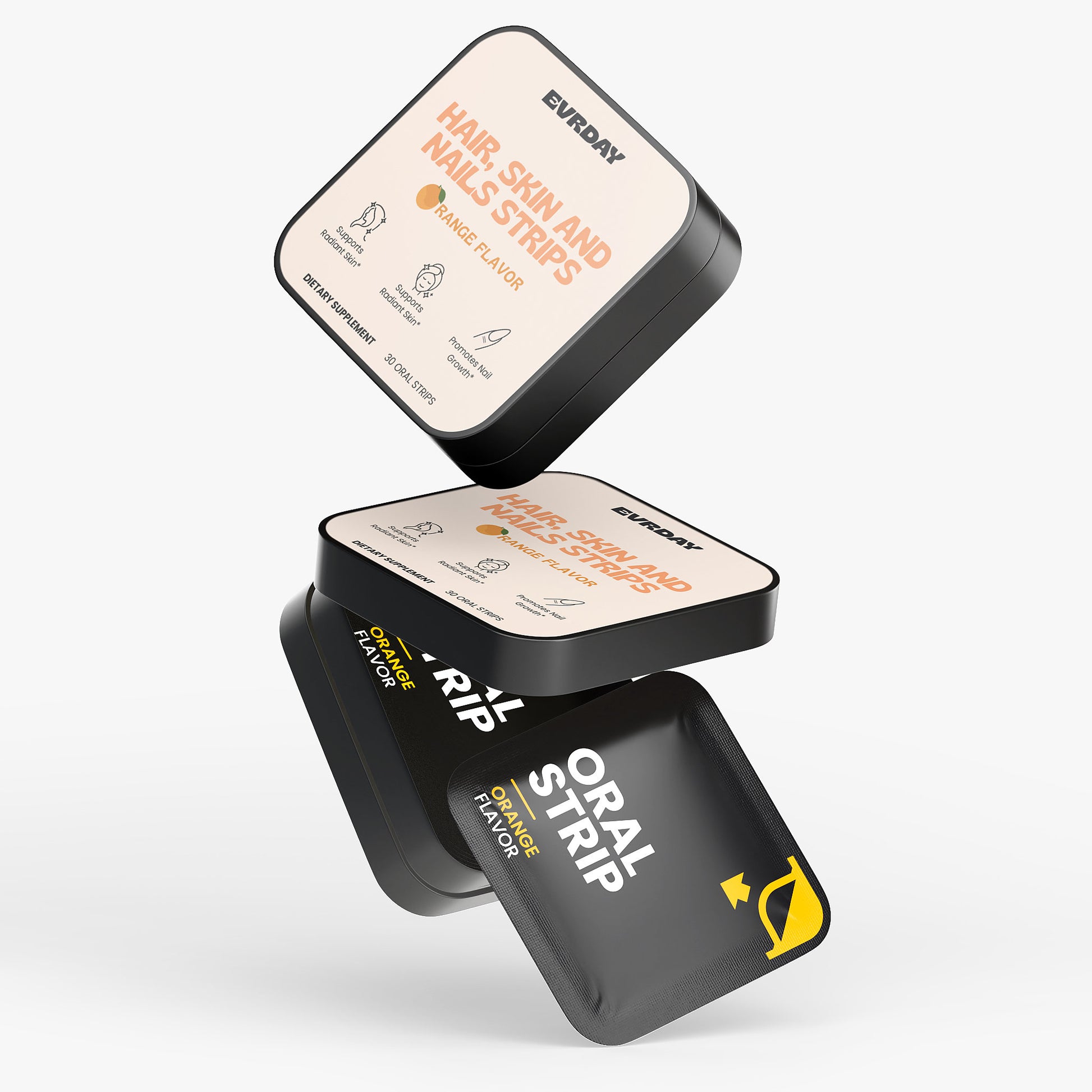 Formulated with biotin, folate, and vitamin D3 to support normal hair, skin, and nail health, delivered in a convenient, fast-dissolving strip for everyday use.*